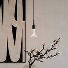 Il cavo tessile coordinato accompagna la struttura con continuità, mentre la lampadina Plumen 001 — inclusa — introduce un elemento scultoreo che diventa punto focale dello spazio.