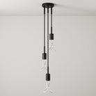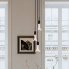 La struttura in metallo nero opaco accoglie la lampadina Plumen 001 in una composizione asimmetrica che rompe la simmetria classica e genera ritmo. Il disegno ondulato della 001 si intreccia con l’essenzialità del metallo, creando una sospensione visivamente forte, pensata per illuminare con carattere.