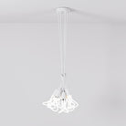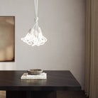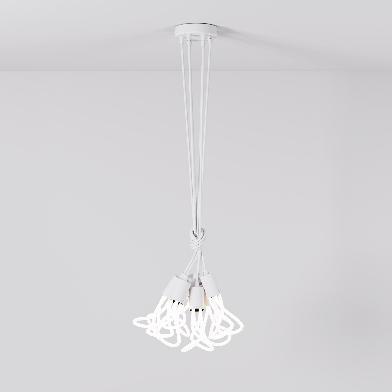 I cavi in tessuto bianco, morbidi e materici, seguono il disegno con discrezione, in dialogo silenzioso con il rosone bianco, compatto ed essenziale, che si fonde con il soffitto per lasciare spazio alla forma.