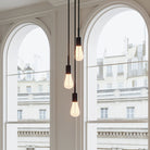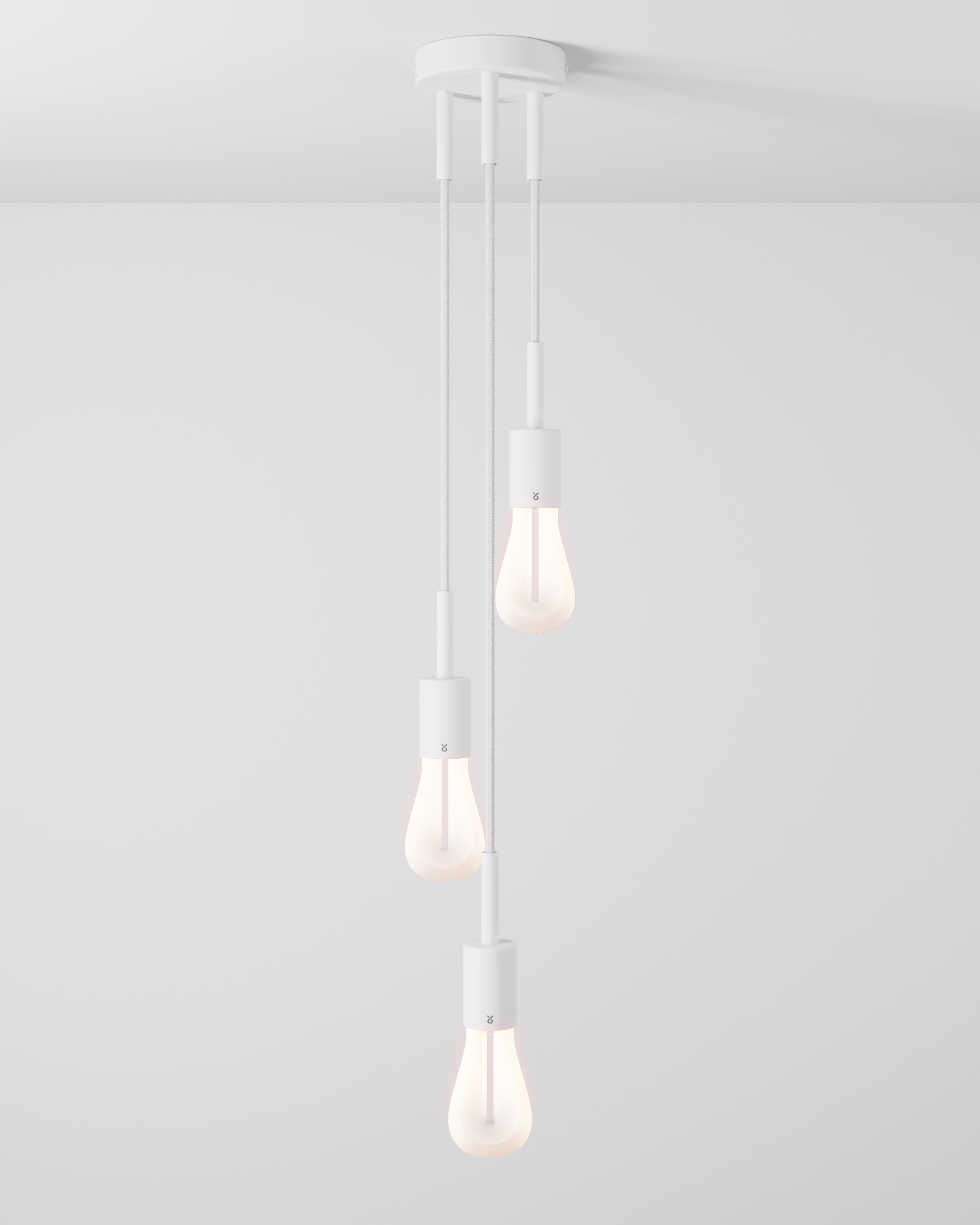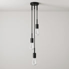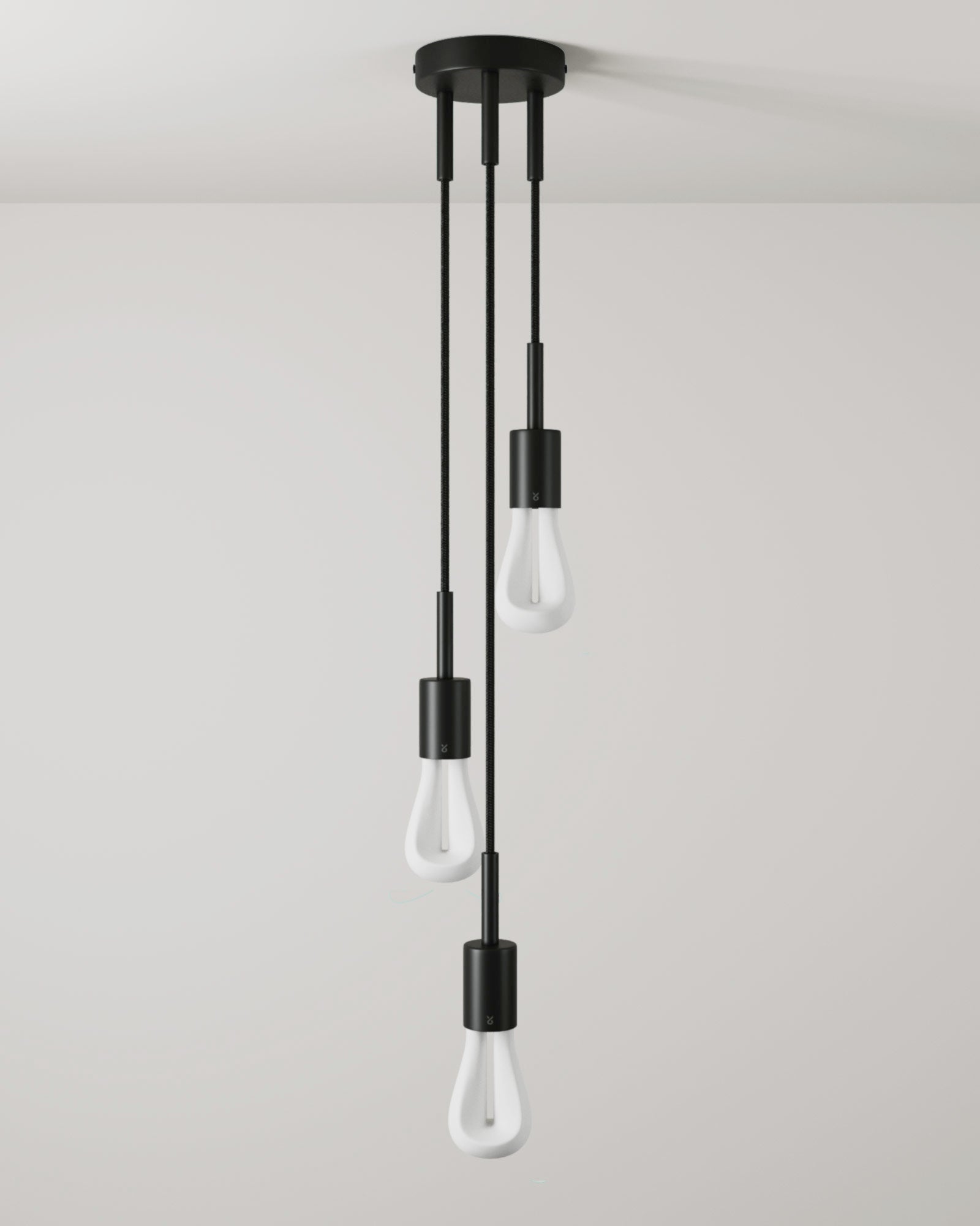 Il metallo nero opaco dialoga con la forma scultorea della lampadina Plumen 002, dando vita a una sospensione a tre cadute irregolari dal carattere deciso. L’asimmetria studiata crea un ritmo visivo dinamico, ideale sopra un tavolo, dove la luce definisce lo spazio e ne sottolinea la centralità.