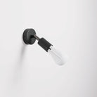 La struttura in metallo nero definisce un segno netto, mentre il braccio flessibile consente di orientare la luce secondo le necessità, mantenendo il disegno sempre coerente.