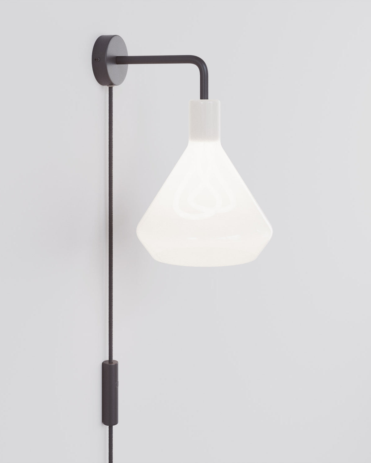Il braccio in metallo e il cavo in tessuto bianco con spina seguono la verticale con coerenza, completando la composizione con equilibrio e intenzione.