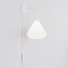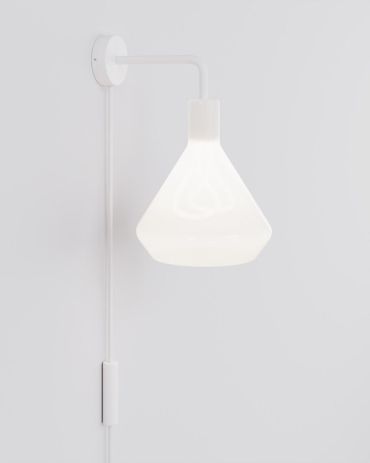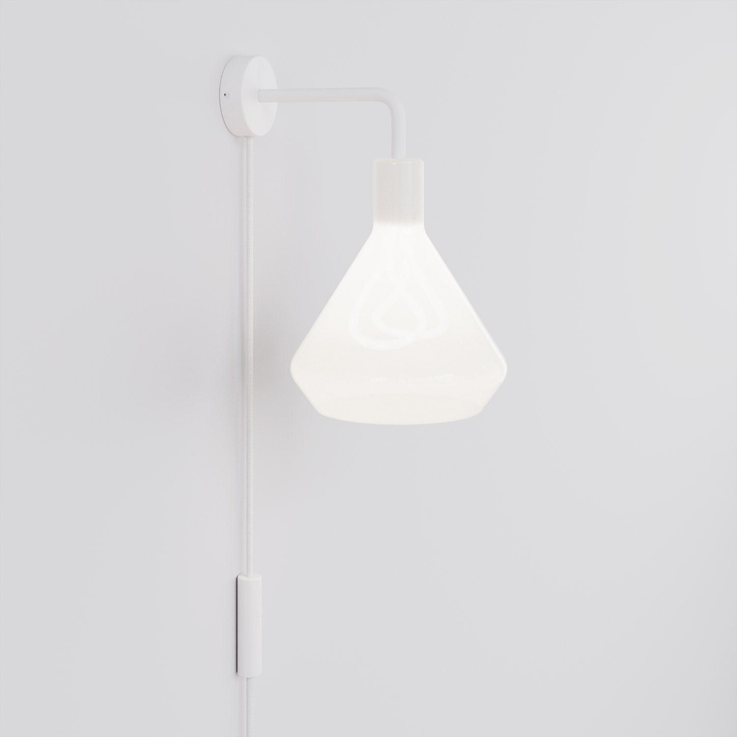 La struttura bianca si integra con il paralume opalino in un insieme continuo e luminoso. La lampadina Plumen 001 si rivela dietro il vetro satinato con il suo profilo scultoreo, trasformando la luce in un elemento grafico riconoscibile.