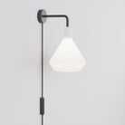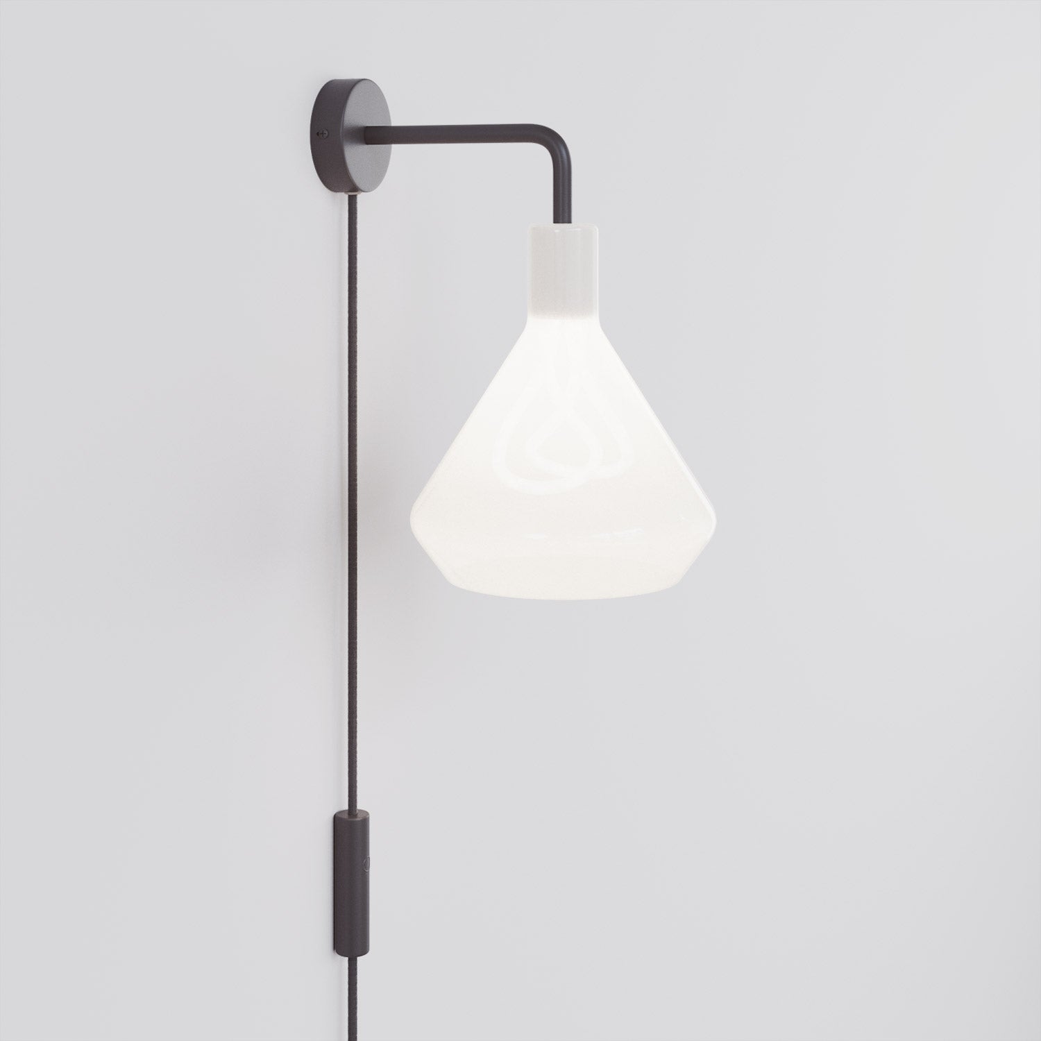 La struttura nera dialoga con il vetro opalino in un insieme visivamente deciso. La lampadina Plumen 001, con il suo profilo scultoreo, emerge dietro la superficie satinata e diventa parte integrante della composizione.
