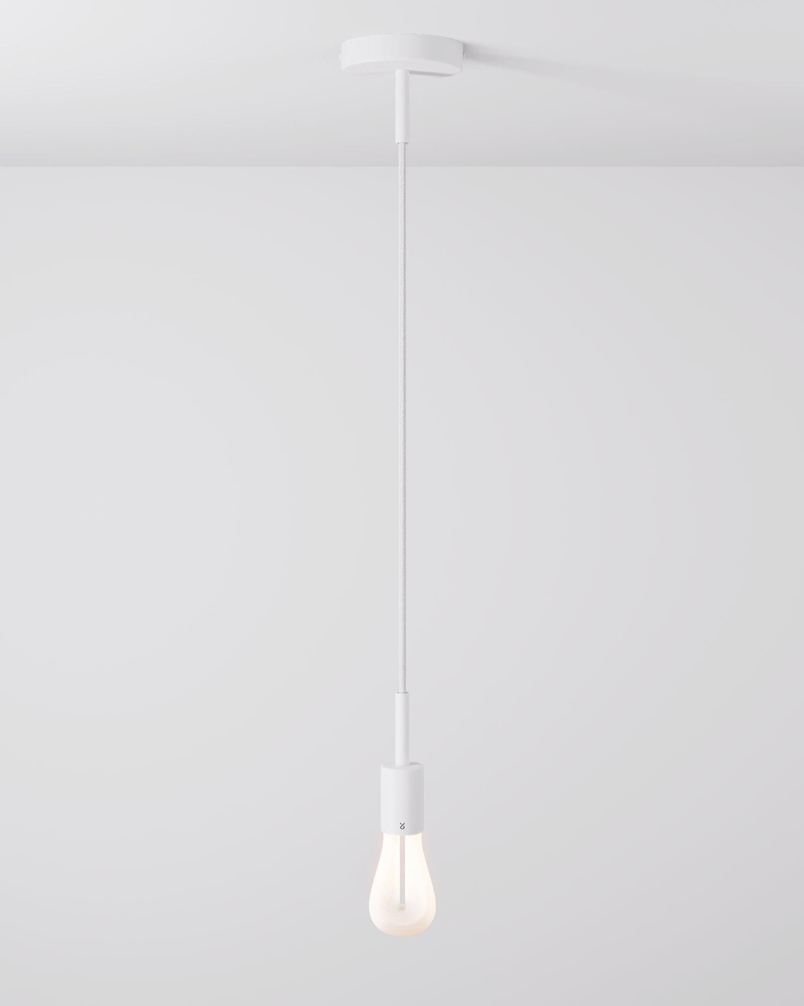 The coordinated textile cable seamlessly accompanies the structure, while the included Plumen 002 bulb spreads a warm, enveloping light that adds depth and atmosphere to the space.