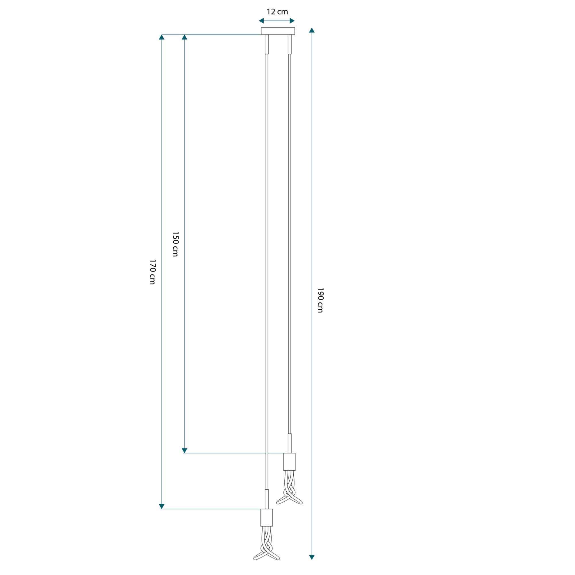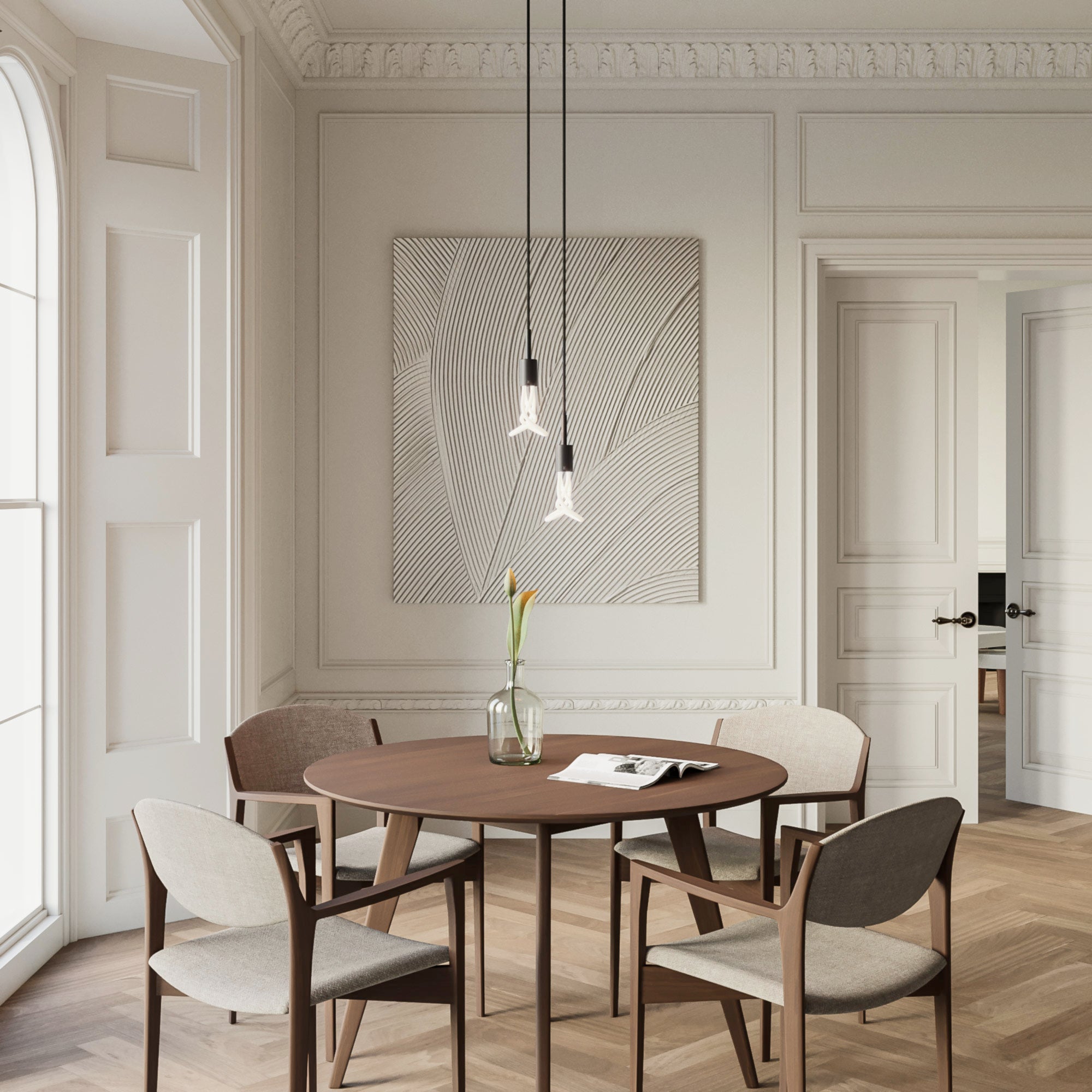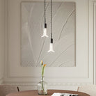 Les câbles recouverts de tissu noir accompagnent la composition avec continuité et matérialité, accentuant la verticalité du dessin et contribuant à l'identité visuelle de la lampe. Idéale au-dessus d'une table, cette suspension crée une lumière scénique et contrôlée, définissant l'espace avec caractère.
