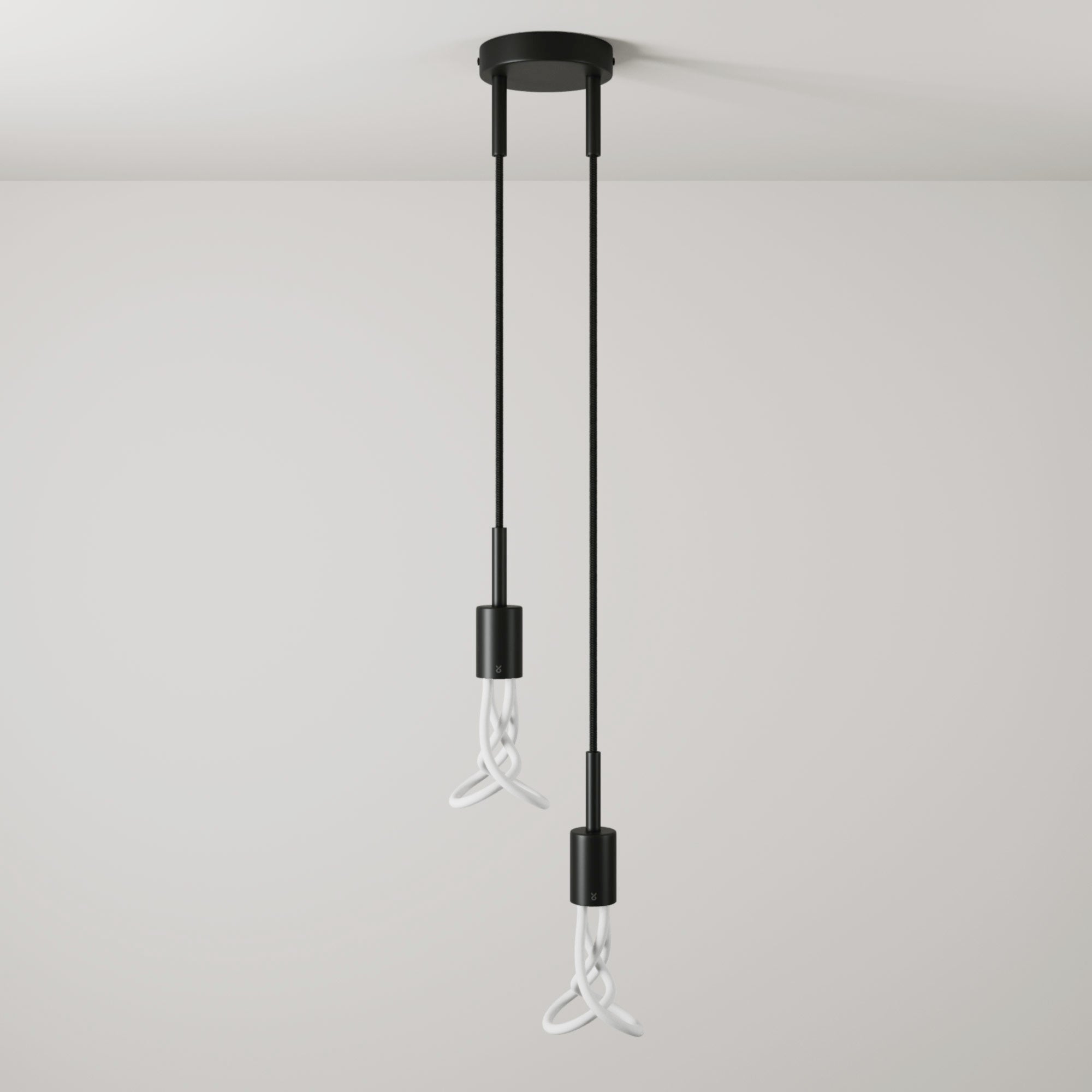 La structure en métal noir mat soutient deux ampoules Plumen 001 dans une composition à chute double, irrégulière et dynamique. Les courbes fluides des sources lumineuses alternent en hauteur, dessinant un signe graphique lisible et affirmé.