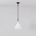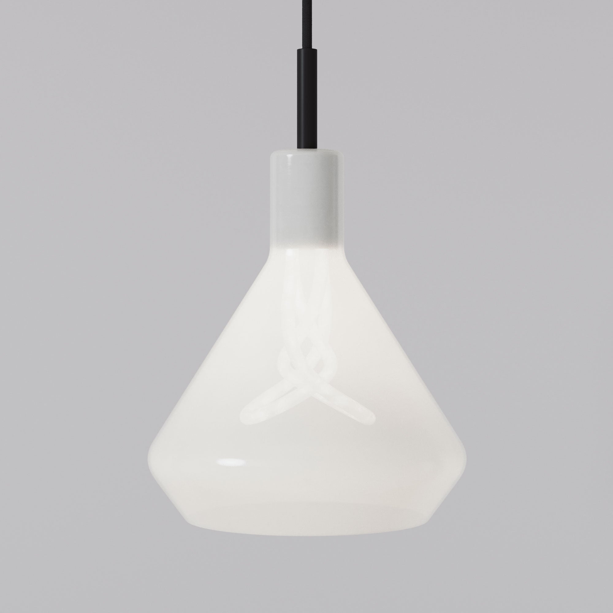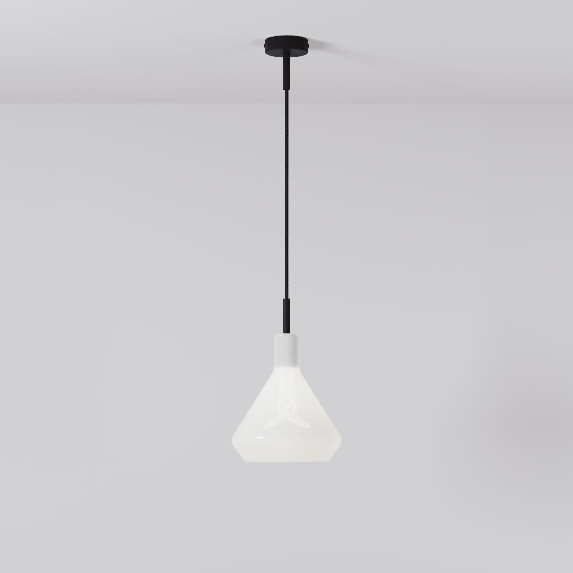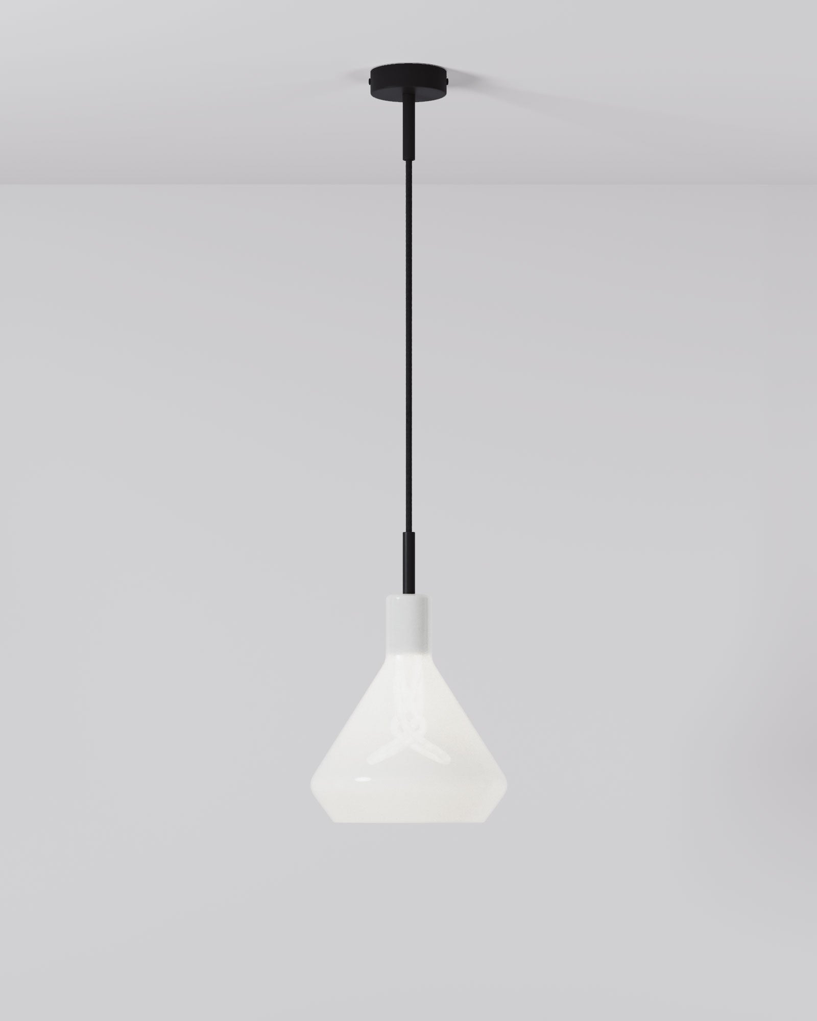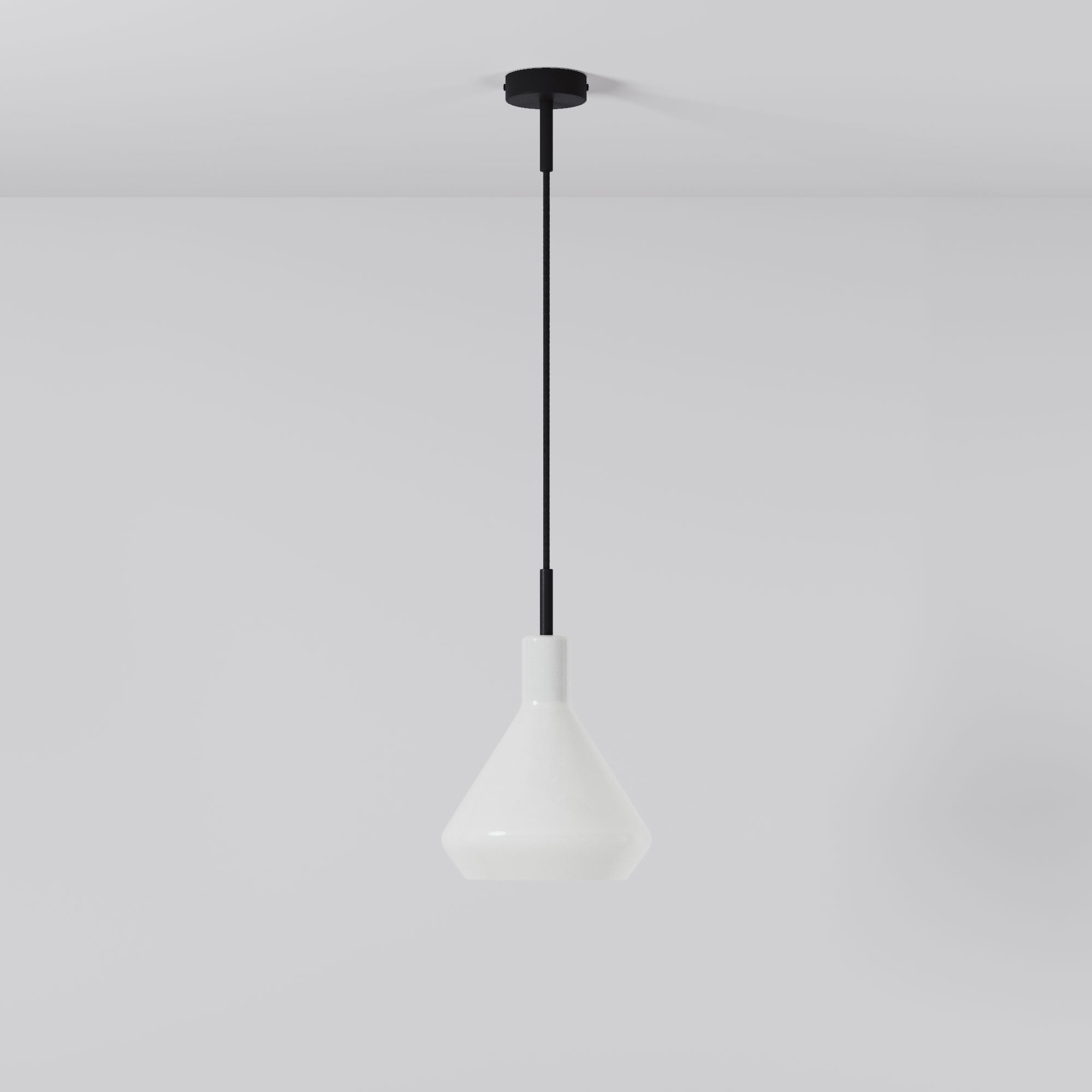 Dans cette configuration, la suspension se distingue par sa clarté de conception : un abat-jour en verre opalin qui diffuse une lumière douce et uniforme, traversé par un câble en tissu noir et un rosace coordonné qui renforcent sa verticalité.